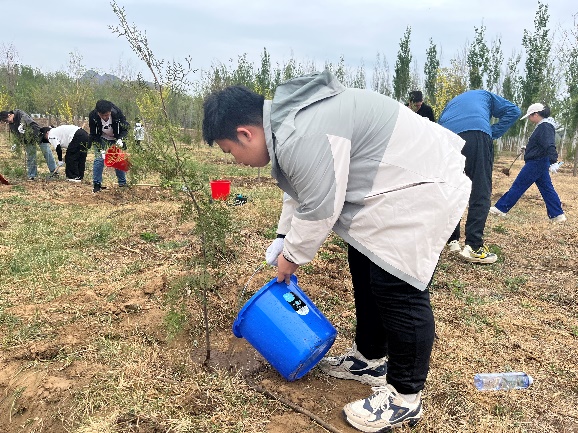 到达义务植树点后,在工作人员的帮助指导下,同学们开始了紧锣密鼓的植树工作。大家拿起自己的树苗,寻找树坑进行种植。我们将树苗埋入土中,用脚踩实泥土,为小树苗浇水。大家看着自己亲手种下的树苗,成就感油然而生,现场互动交流频繁且热烈。看着远处一颗颗茁壮成长的大树,也希望自己的小树苗可以如前人所种之树一样茁壮成长,为大地增添一抹绿色。