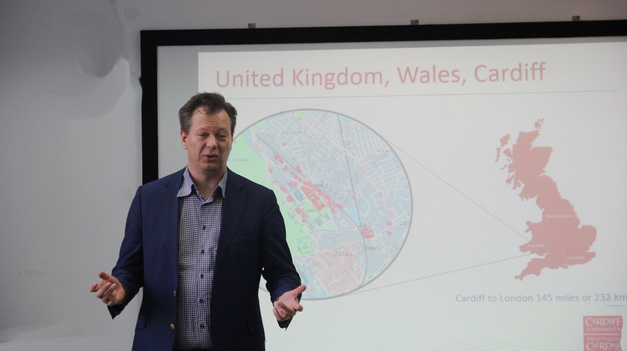 Johannes Benedikt教授首先介绍了卡迪夫大学的地理环境优势。卡迪夫大学坐落于英国威尔士首府卡迪夫市中心。威尔士是一个精致而又美丽的城市,而卡迪夫市作为威尔士的首府,在英国的地位等同伦敦与苏格兰首府爱丁堡,它拥有着首都市的设施,美丽的城堡,还有位于市中心的校园--卡迪夫大学。