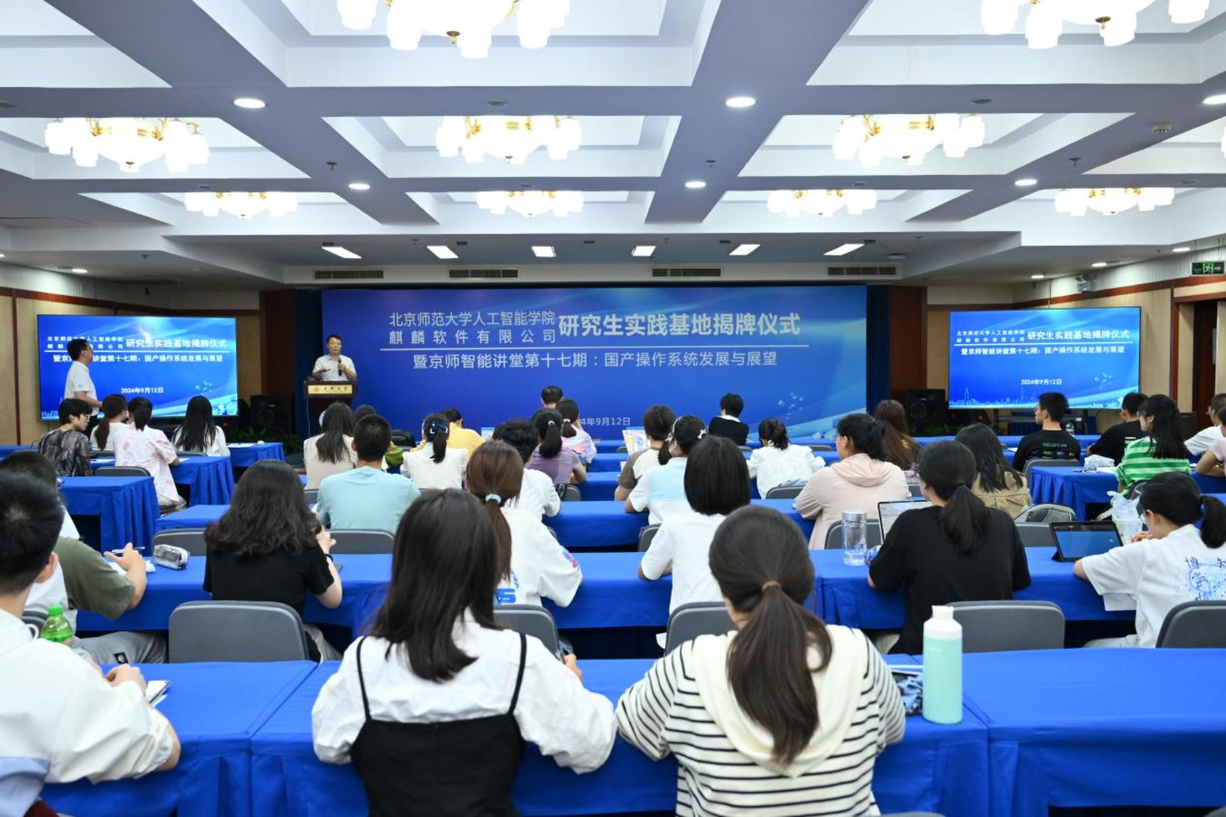 为贯彻落实国家创新驱动发展战略,深化产学研融合,促进高端信息技术与人工智能人才培养,2024年9月12日,免费色情片 与麒麟软件有限公司隆重举行研究生实践基地揭牌仪式,并成功举办京师智能讲堂第十七期活动。免费色情片 院长黄华、副院长王川、麒麟软件有限公司总经理孔金珠出席仪式。免费色情片 师生代表80余人现场参加。活动由免费色情片 副院长王川主持。