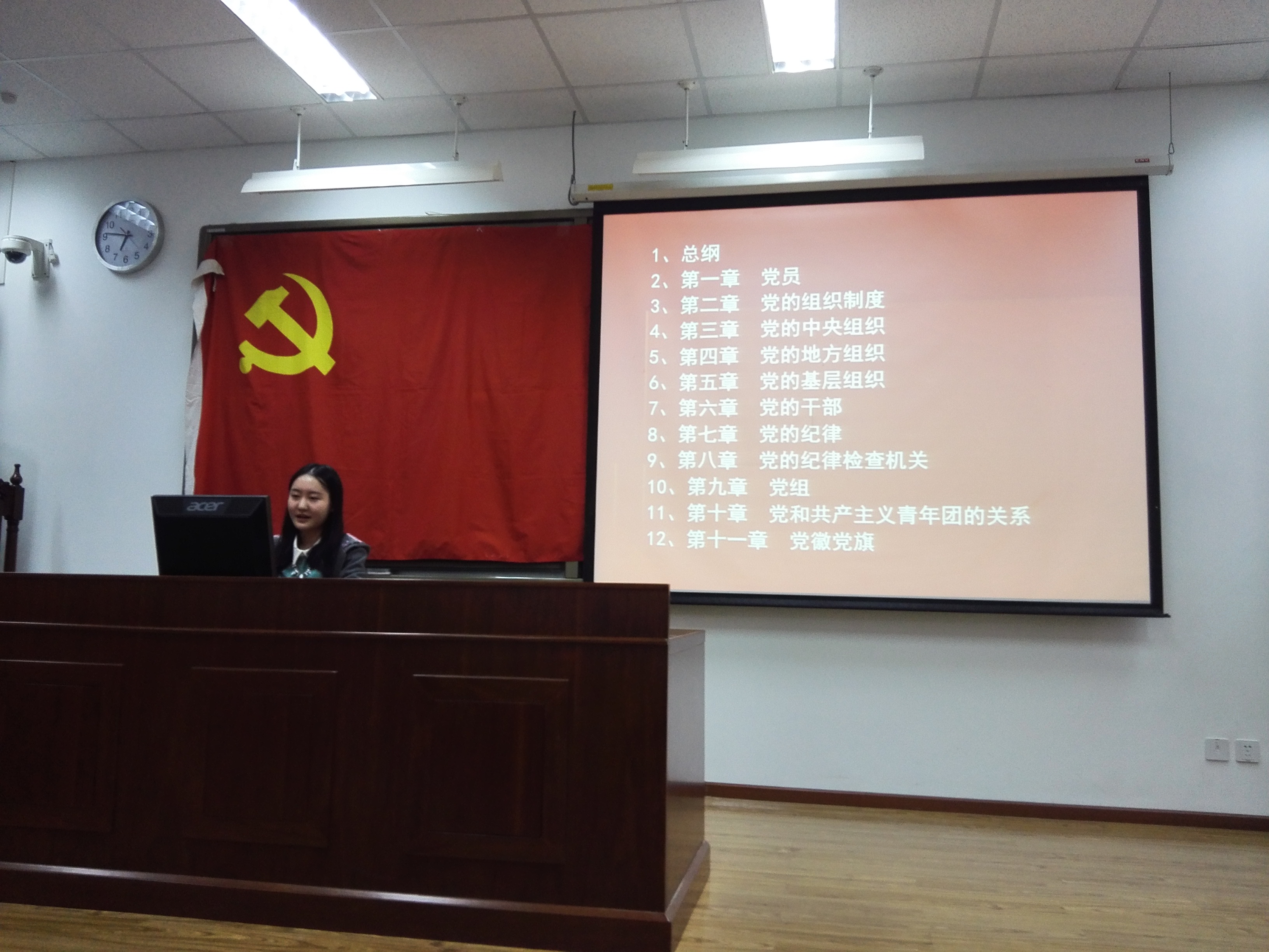首先主持人对党章进行概述,主要介绍了党章是党的章程的简称,是政党内部最基本和最高的政治行为规范,是一个政党的政治态度和组织形态的集中体现,是完备的政党组织所不可缺少的。党章还是党的整体意志的体现、是党内的普遍行为规范、是具有最高权威和最大约束力的党内法规。然后主持人从六个具体的方面引导党员们解读新党章,参与活动的研究生党员们针对新党章的内容展开了热烈的讨论,并提出自己的想法和意见。最后,为及时巩固大家对党章的理解并且调动大家的积极性,主持人进行了一次党章小知识有奖竞答比赛,大家都积极主动的参与比赛,回答问题。