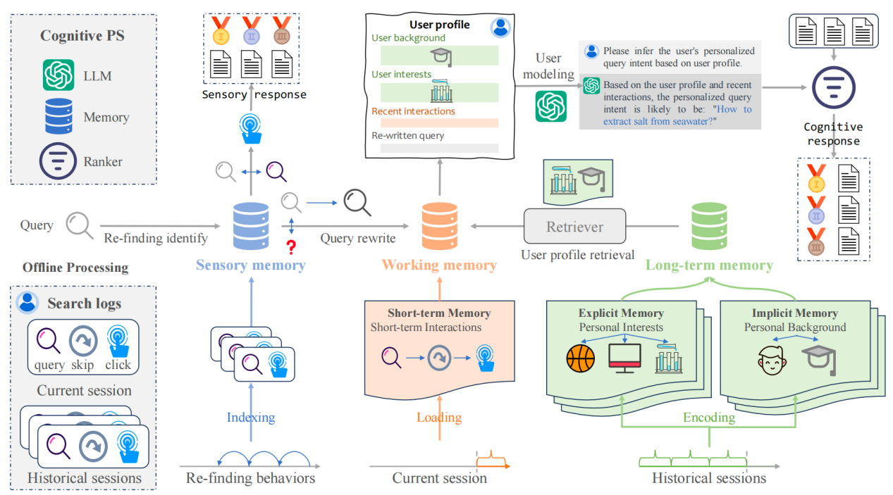 论文概述:传统的搜索引擎通常为所有用户提供完全相同的搜索结果,而忽略了用户个人偏好。为应对这一局限,研究人员探索个性化搜索技术,根据从查询日志中得出的用户偏好对搜索结果重新排序。目前基于深度学习的个性化搜索方法已初见成效,但它们严重依赖丰富的训练数据,容易受到数据稀疏性的挑战。因此,本文提出认知记忆驱动的个性化搜索模型CoPS,将大语言模型(LLM)与受人类认知启发的认知记忆机制相结合,利用携带自适应记忆机制的大语言模型来增强用户建模和用户搜索体验。在该模型中,认知记忆机制包括用于快速感官反应的感官记忆、用于复杂认知反应的工作记忆和用于存储历史交互信息的长期记忆。同时,CoPS采用三步法处理新查询以执行搜索任务,包括识别重新查找行为,利用相关历史信息构建用户画像,以及根据个性化查询意图对文档进行排序。实验表明,CoPS 在zero-shot场景下的表现优于基线模型。