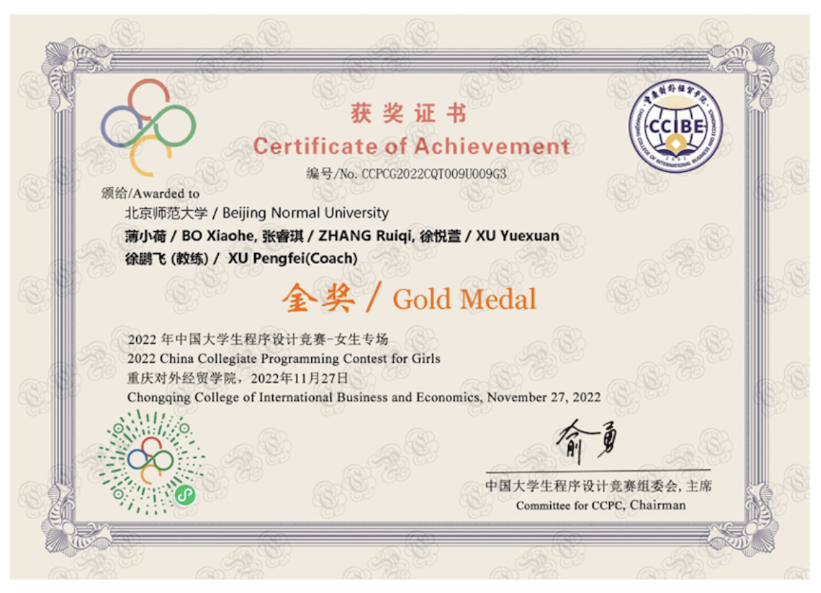 终于,在不懈的努力和坚持下,我在编程竞赛中取得了一些成绩。我获得了中国大学生程序设计竞赛女生专场金牌,以及国际大学生程序设计竞赛亚洲区决赛的铜牌。这些成绩不仅是对我努力的肯定,也是对我未来的激励。